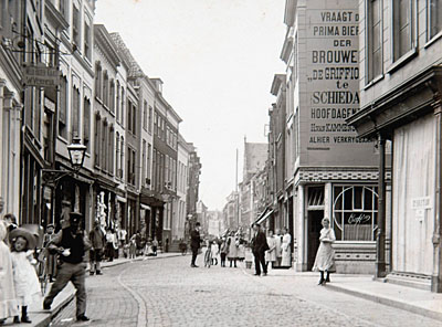 Visstraat hoek Voorstraat met de Waalse kerk met een …