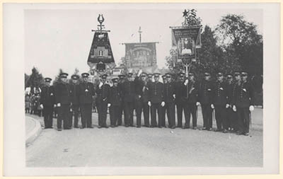 Politieharmonieconcours. Links het vaandel van de Dordtse …