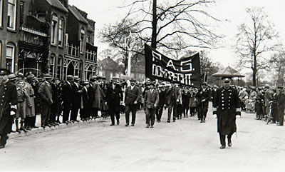 Een groep mannen achter het vaandel P.A.G. lopen in het …