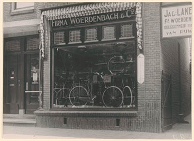 Etalage van rijwielhandel firma Woerdenbach & Co. met …