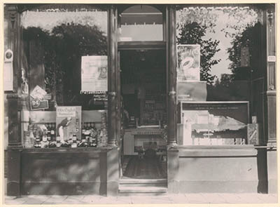 Ingang en etalages van de winkel in comestibles en …