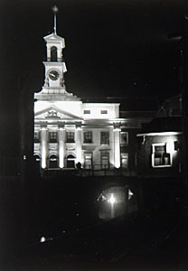 Verlichte voorgevel van het stadhuis gezien vanaf de …