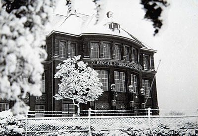 Gezicht op de achterkant van het kantoor van de Eerste …