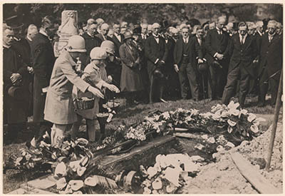 Drie meisjes strooien bloemen op het nog open graf van …