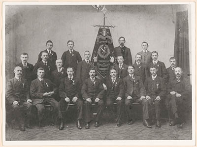 Groepsportret van de slagersgezellenvereniging …