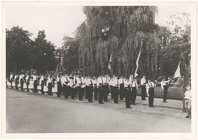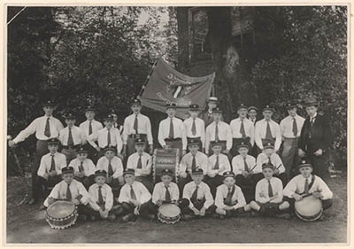 Het tamboer- en pijperkorps Jubal met vaandel, …