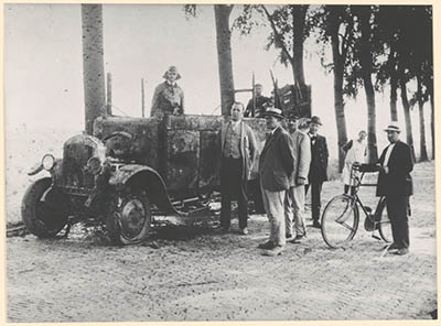 Brandweerlieden en belangstellenden bij een uitgebrande …