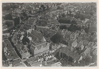Luchtfoto van het gebied rondom de Grote Kerk. Te …