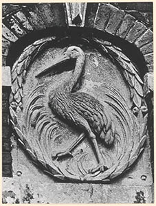 Gevelsteen met een door lauweren omkranste ooievaar in …