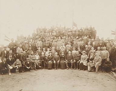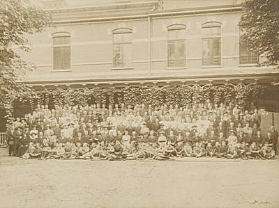 Groepsportret van directie en familie en personeel van …