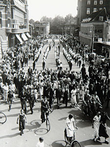 Intocht van deelnemers aan de Vierdaagse van Nijmegen. De …