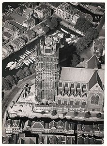 Luchtfoto van de Grote Kerk in de steigers. Van onder …