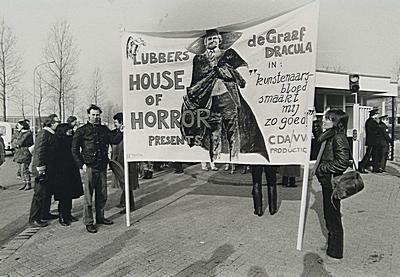 Kunstenaarsprotest met spandoek tegen het beleid van …