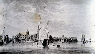 Tekening van Dirk de Jong van het veer over de Oude Maas. …