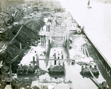 De damwand van de nieuwe kademuur en de bewapening voor …