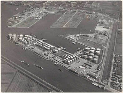 Luchtfoto van de opslagtanks van Gebr. Broere aan de …