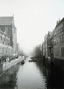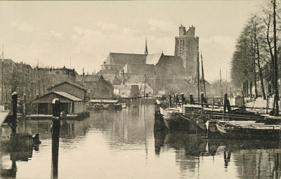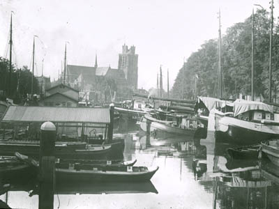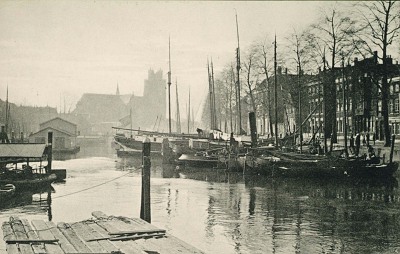 Nieuwe Haven richting Grote Kerk. Links een visvlot en …