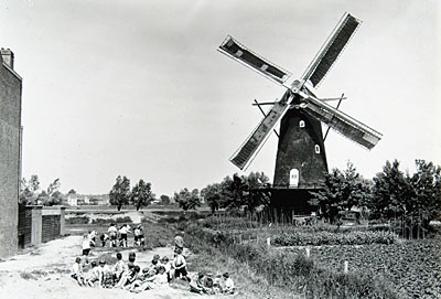Spelende kinderen bij korenmolen Willem II aan de …