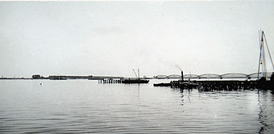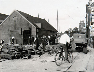 Vanaf de Moerdijk-kant gezien is men bezig houten …