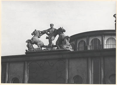 Beeldengroep van een man die 2 paarden bedwingt boven de …