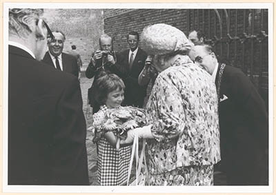 Een meisje biedt koningin Juliana bloemen aan bij haar …