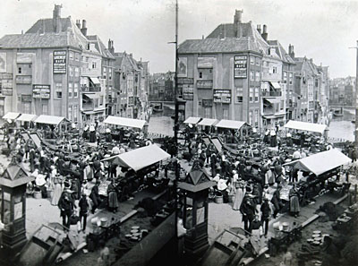 Stereofoto van de markt op het Scheffersplein, gezien in …