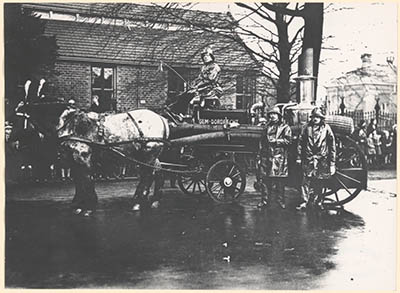 De door paarden getrokken koperen stoomspuit - Het …