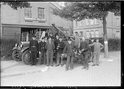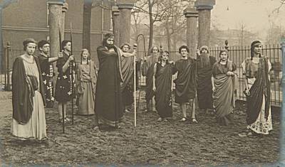 Groepsportret van toneelspelers in het drama Antigoné. …