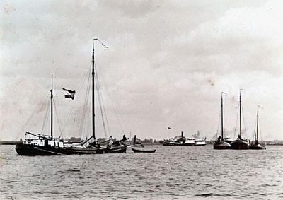 Zeilschepen en een stoomboor op de rivier bij Dordrecht.