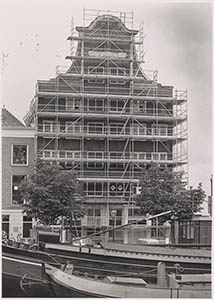 De voorgevel in de steigers tijdens de restauratie van …
