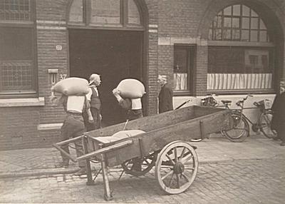 Meel wordt uit een handkar geladen en binnengebracht bij …