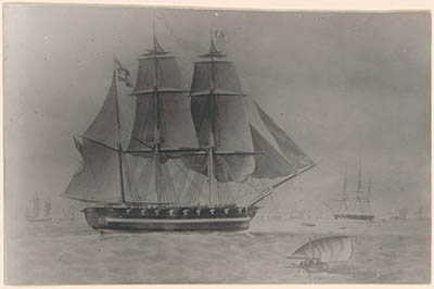 Tekening van een bark met het wapen van Dordrecht op de …