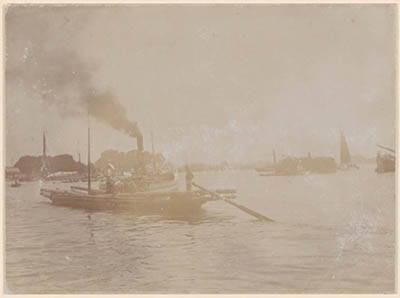 Hooikade met raderboot, met op de achtergrond de Grote Kerk