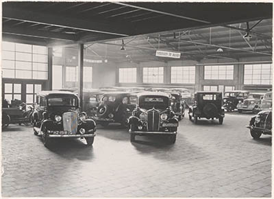 Werknemers bij de fabricage van gewapend beton-planken in …