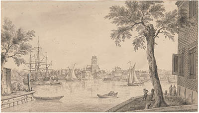 Gezicht op de stad Zwijndrecht ter hoogte van de Grote Kerk.