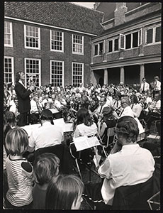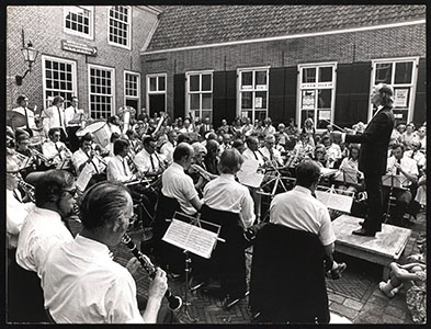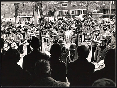 Muziekkorps bij schouwburg Kunstmin op de Sint Jorisweg.