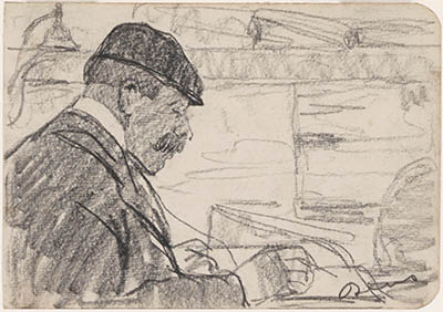 Schrijvende man met pet en snor.