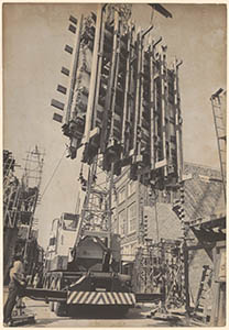Een hijskraan verplaatst een deel van een oude voorgevel …