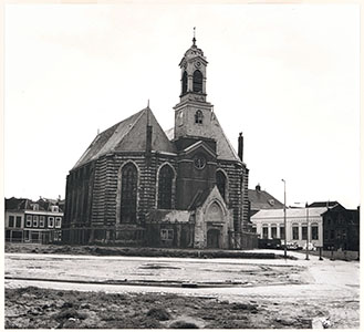 De vervallen Nieuwkerk op het Nieuwkerksplein, gezien …
