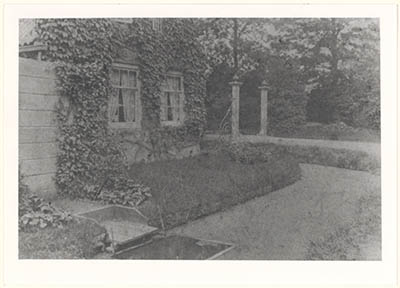Huisje aan sloot en oprijlaan met toegangshek (ca 1900); …