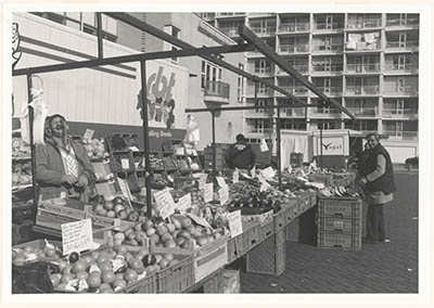 Marktkoopman met groenten en fruit op het Dahlmeyerplein. …