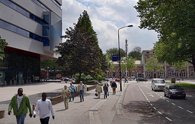 De stationsweg in de richting van het station. Links het …