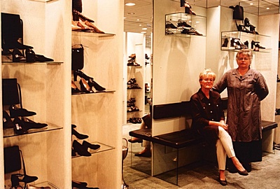 Interieur van een schoenenwinkel met twee verkoopsters