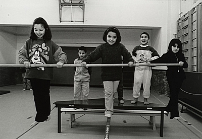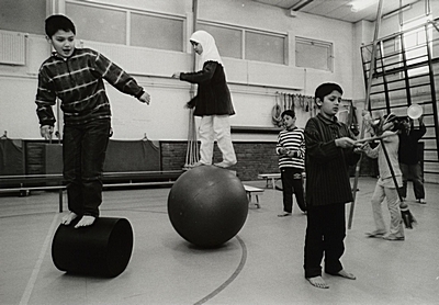 Kinderen spelend in de gymzaal van de Mondriaanschool aan …