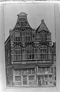 Tekening van hoek Aardappelmarkt-Kuipershaven met het …