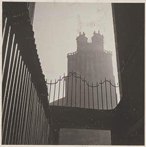 Gezicht op de Grotekerkstoren van het Maartensgat.