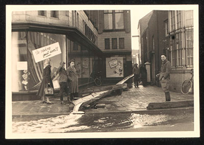 Tijdens de watersnood vernielde etalage van Kofa Linders …