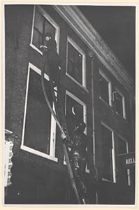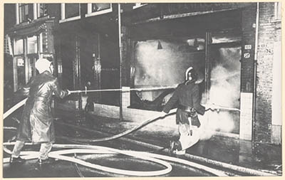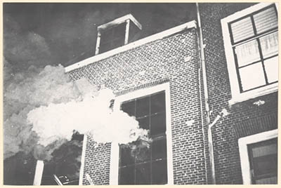 De achterzijde van het brandende pand van de handel in …