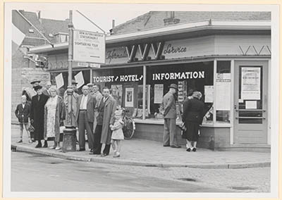Deelnemers aan een stadsrondrit bij de VVV-kiosk in de …