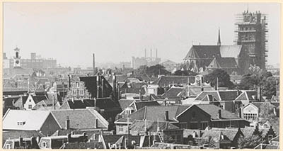 De Grotekerkstoren in de steigers, gezien over de …